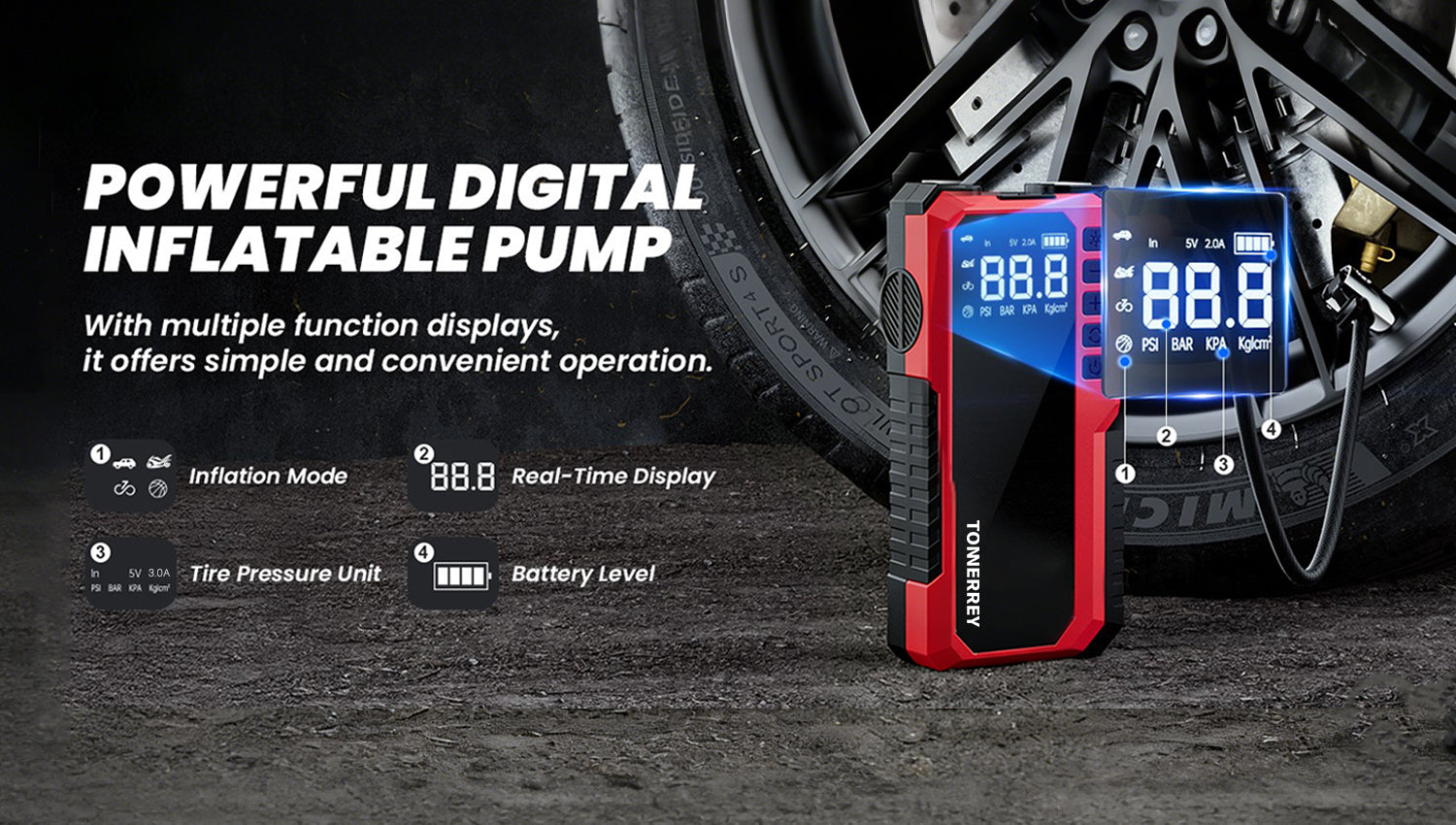 Multiple attachments and preset modes, makes it easy to inflate car tires, motorcycle tires, bicycles, and sports inflatables, all from one compact device.