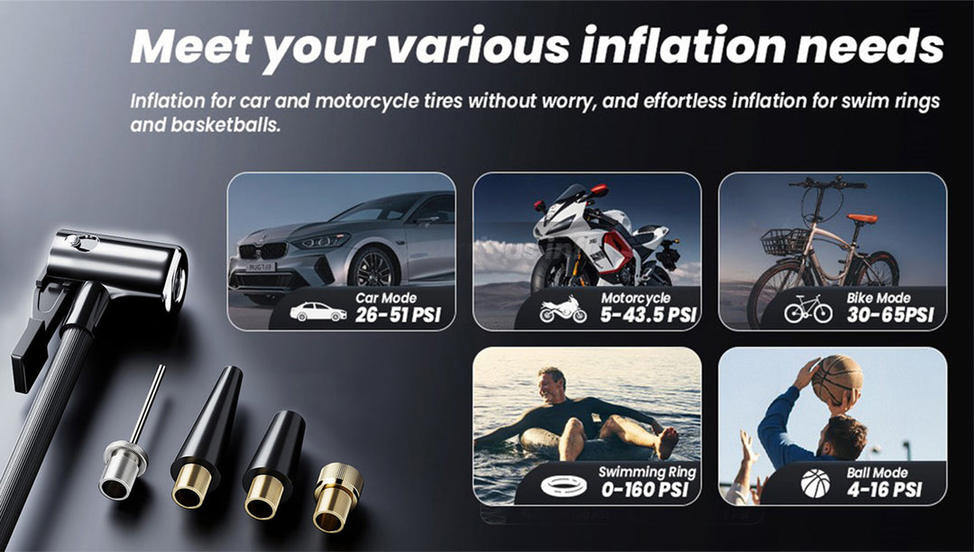From car and bike tires to sports inflatables, one versatile device adapts effortlessly to different inflation needs—making daily vehicle care and outdoor tasks faster and simpler.