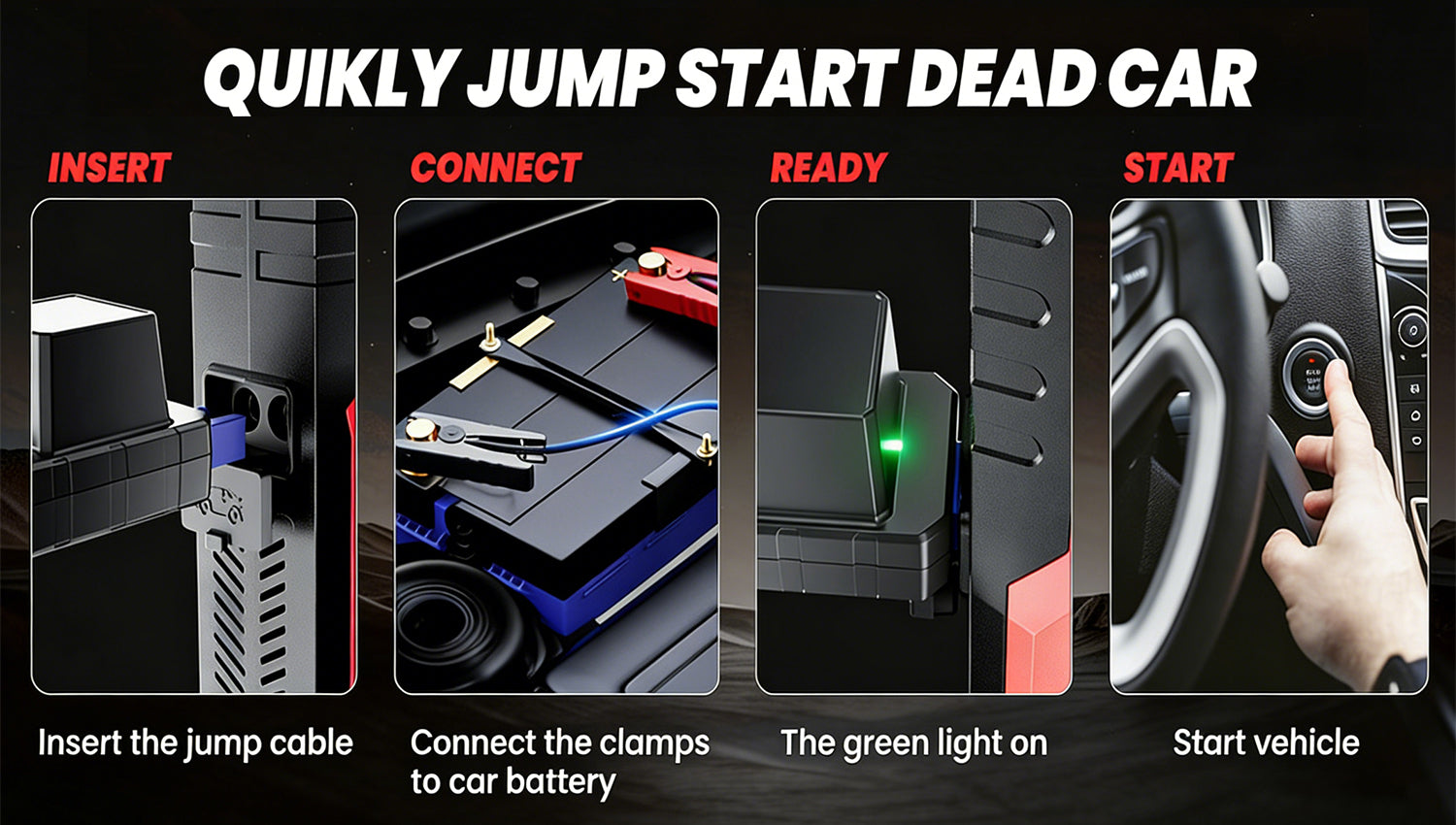 A: Simply insert the jump cable, connect the clamps to the car battery, wait for the green light, and start your vehicle. The process is quick and easy, even for beginners.